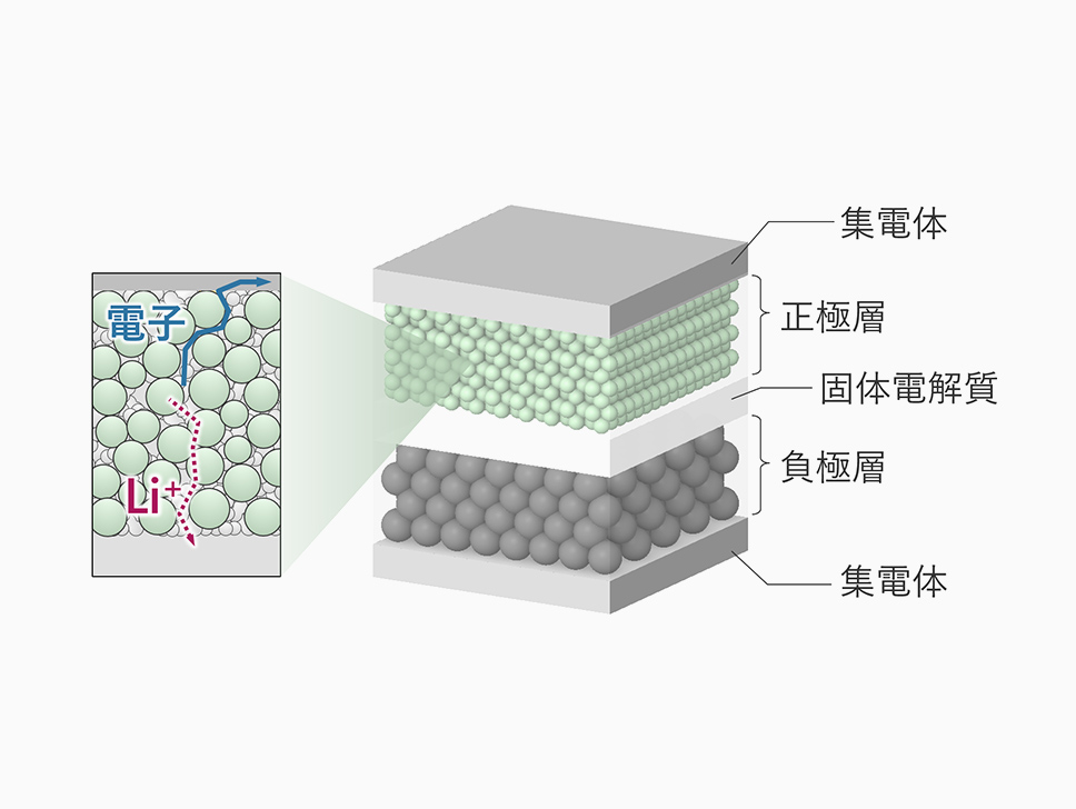 次世代電気自動車用の電池として、構成する電極、電解質が全て固体で構成され、電池容量やエネルギー密度の向上、高速充放電が可能となる全固体電池の実用化が期待されています。