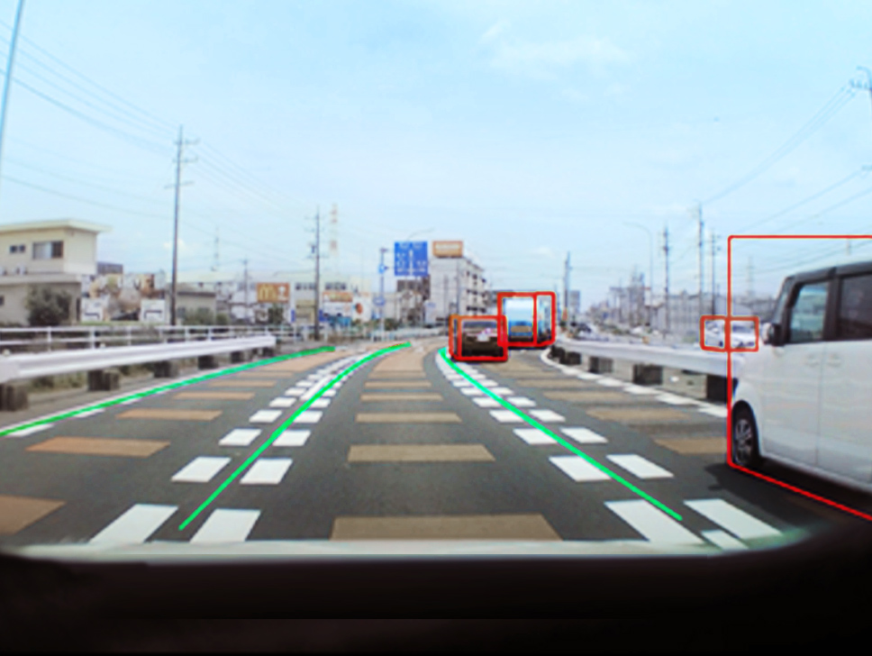 カメラを用いて検知した車両・歩行者、走行路、交通標識などの情報を学習アルゴリズムで認識し、事故ゼロに向けた車両制御の実現を目指しています。