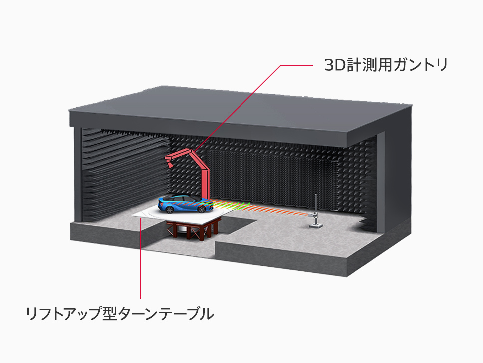 車両が入る大型電波暗室・無響音室を用いて、独自高精度プローブで車両周辺の電波・音波の伝搬メカニズムを解明しています。