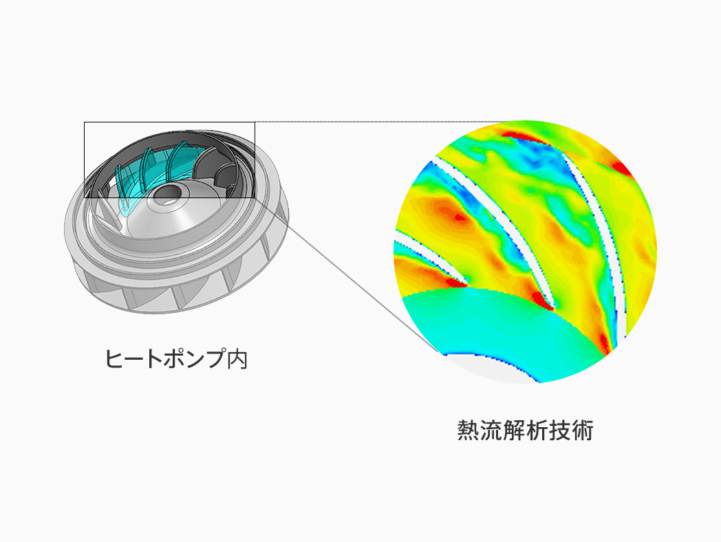 このときの冷媒、水、空気の流れ方、乱れ方が熱交換時の効率や騒音を決定するため、SOKENはその流れや乱れを視える化することで、無駄のない流れを追求しています。